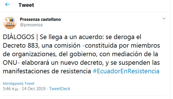 Με το hashtag #Ecuadorenresistencia και μέσα από την αίθουσα των διαπραγματεύσεων το γραφείο της Pressenza στο Εκουαδόρ ανακοίνωσε πριν από μερικές ώρες ότι κυβέρνηση και λαός έφτασαν σε μια συμφωνία που περιλαμβάνει την κατάργηση του διατάγματος 883 (που καταργούσε την επιδότηση των καυσίμων) και τη σύσταση ομάδας που από κοινού θα συζητήσει νέο νομοθετικό πλαίσιο. Η ομάδα εργασίας θα περιλαμβάνει μέλη της κυβέρνησης, οργανώσεις, οργανώσεις αυτόχθονων, ενώ μέλη του ΟΗΕ θα αναλάβουν ρόλο διαμεσολαβητών. Ως κίνηση καλής θέλησης για να φτάσουν οι συζητήσεις σε ένα από κοινού αποδεκτό αποτέλεσμα, οι εκπρόσωποι των διαδηλωτών αποφάσισαν να αναστείλουν επίσης τις διαμαρτυρίες.