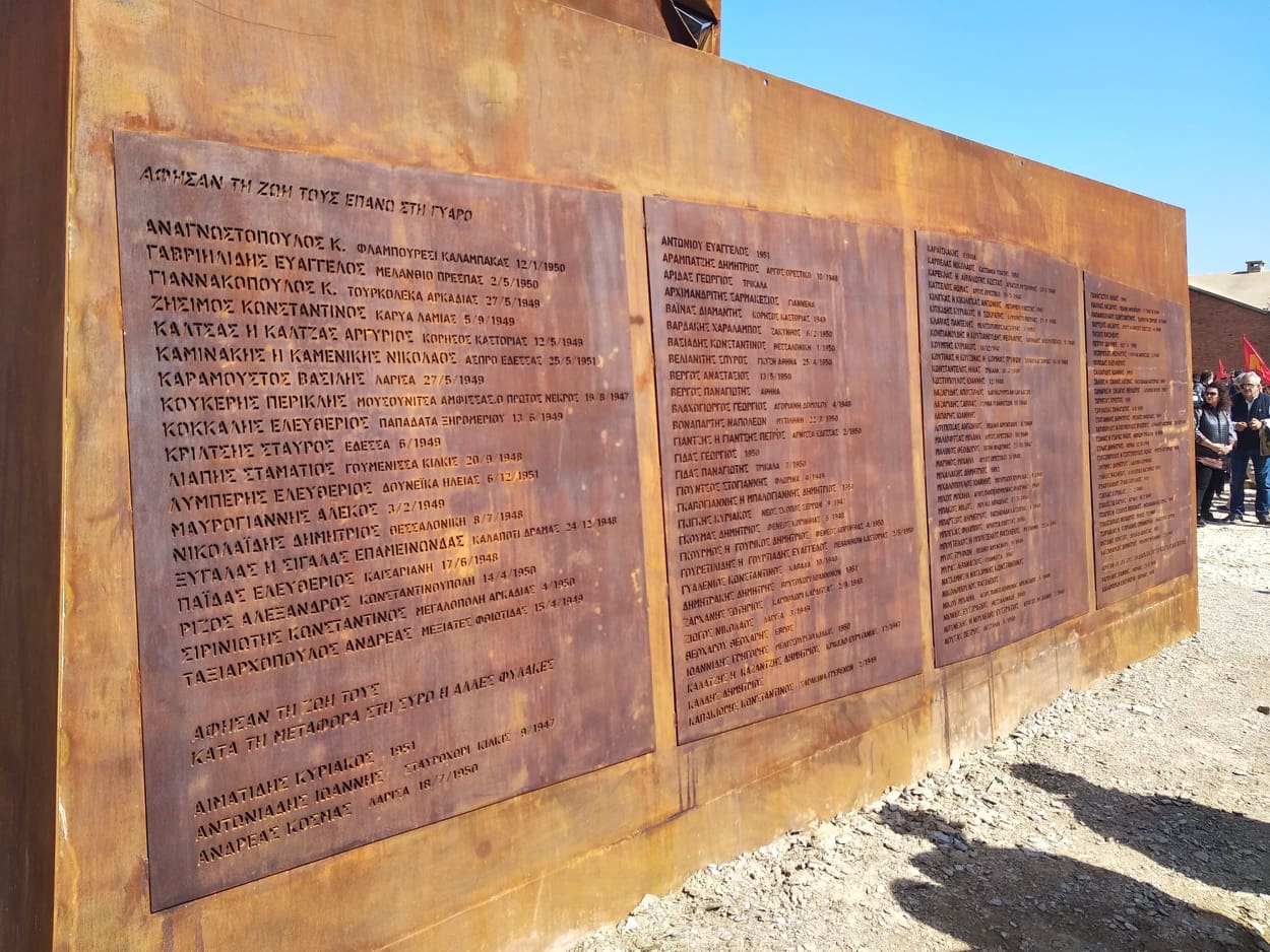 Στην τελετή παρευρέθηκαν 500 μέλη και υποστηρικτές από την Αθήνα και περίπου 200 από τα γύρω νησιά. Κατά τη διάρκεια της, απηύθυναν χαιρετισμό ο Δημήτρης Γόντικας, μέλος της ΚΕ του ΚΚΕ, που τόνισε την εκπλήρωση του ηθικού χρέος του ΚΚΕ για την αποκατάσταση της μνήμης των εξόριστων, φέτος που συμπληρώνονται 100 χρόνια από την ίδρυση του κόμματος και ο γλύπτης Αντώνης Μυρωδιάς. Στην κεντρική ομιλία ο γγ της ΚΕ του ΚΚΕ, Δημήτρης Κουτσούμπας, αφού αναφέρθηκε στην πολυτάραχη ιστορία του νησιού, έκανε τις συνδέσεις με τους σημερινούς αγώνες. Ανάμεσα στο πλήθος ξεχώριζαν και κάποιοι από τους επιζήσαντες, που κατάφεραν να κάνουν αυτό το δύσκολο ταξίδι, ενώ αρκετοί ήταν και οι συγγενείς των εκτοπισμένων που ήθελαν να αποτίσουν τον προσωπικό τους φόρο τιμής, κρατώντας φωτογραφίες που τους είχαν αποστείλει οι δικοί τους, κατά τη διάρκεια της εξορίας τους. Σ’ όλη τη διάρκεια της τελετής, ο αέρας – χαρακτηριστικό του νησιού – δεν σταμάτησε να λυσσομανάει.