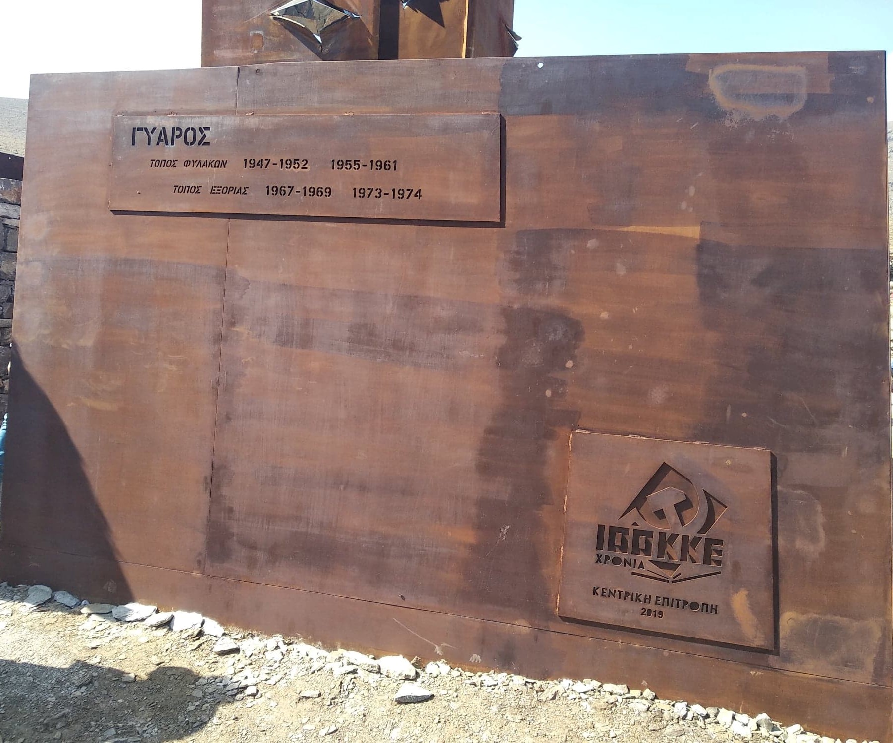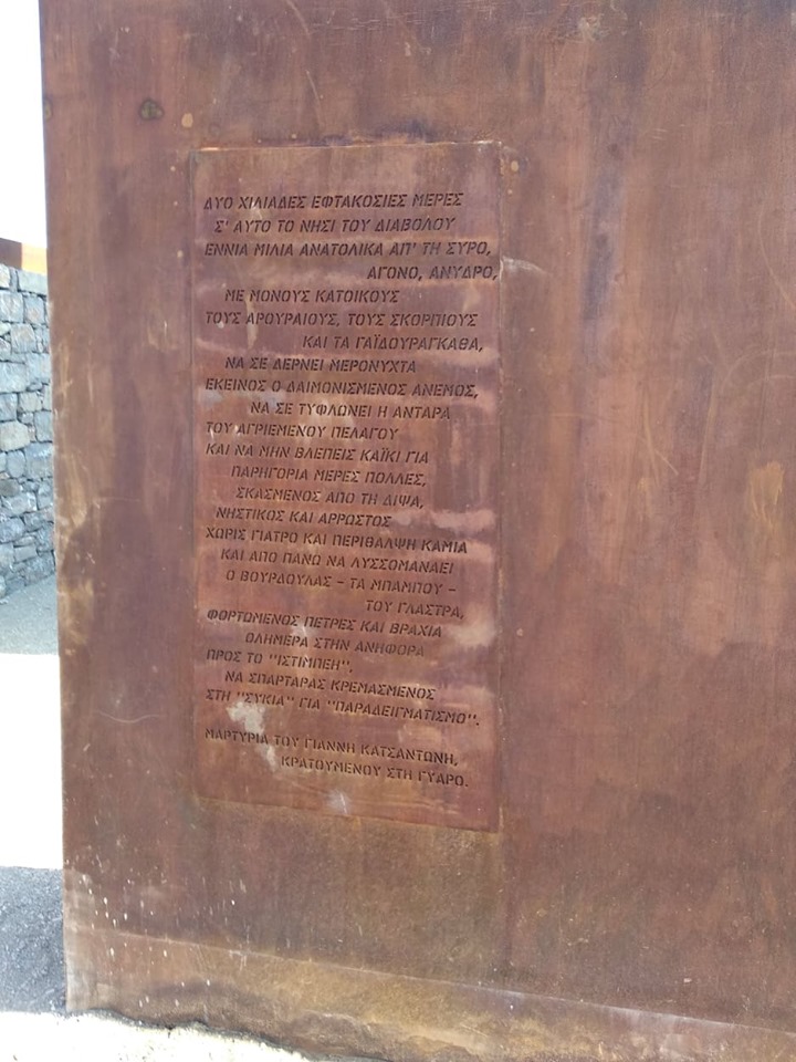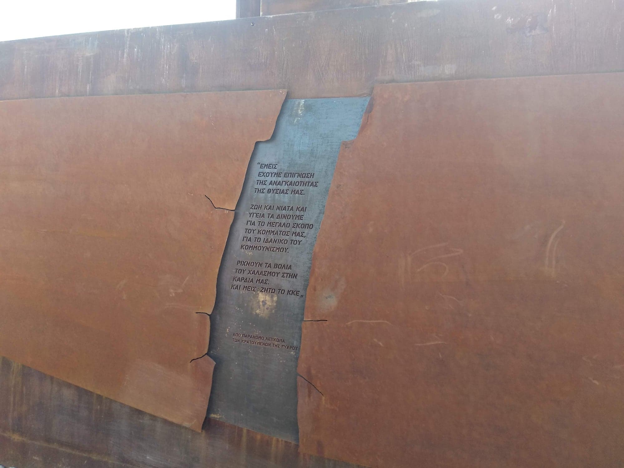Στη Γυάρο ή Γιούρα, όπως την έλεγαν οι εξόριστοι πολιτικοί κρατούμενοι, τελέστηκαν το Σάββατο 12 Οκτώβρη τα αποκαλυπτήρια του μνημείου «Ρωγμή», φιλοτεχνημένο από το γλύπτη Αντώνη Μυρωδιά που βραβεύτηκε στον πανελλήνιο καλλιτεχνικό διαγωνισμό που είχε προκηρύξει το ΚΚΕ.