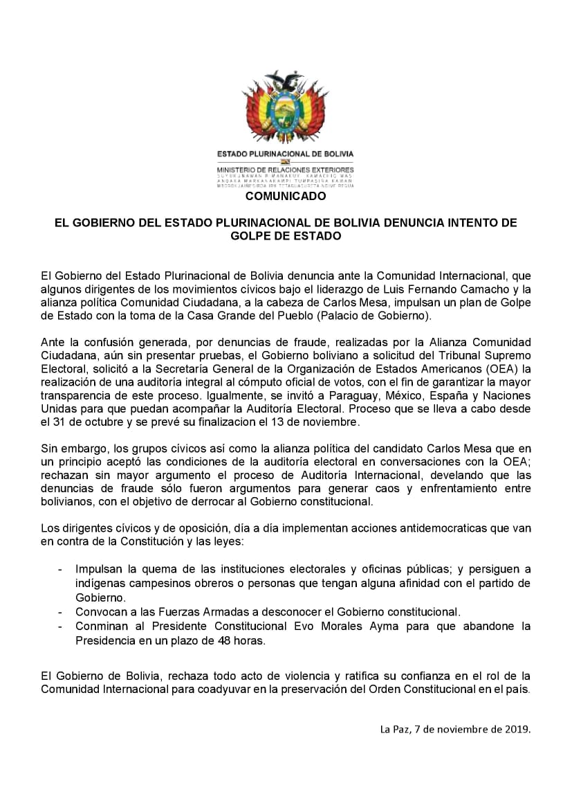 Με χτεσινό δελτίο τύπου, η κυβέρνηση του κράτους της Βολιβίας καταγγέλλει, ενώπιον της διεθνούς κοινότητας, απόπειρα πραξικοπήματος, προωθούμενη από μια ομάδα πολιτών με επικεφαλής τον Luis Fernando Camacho σε συνδυασμό με την Κοινοτική Συμμαχία των Πολιτών και του υποψηφίου τους στις πρόσφατες εκλογές, Carlos Mesa.