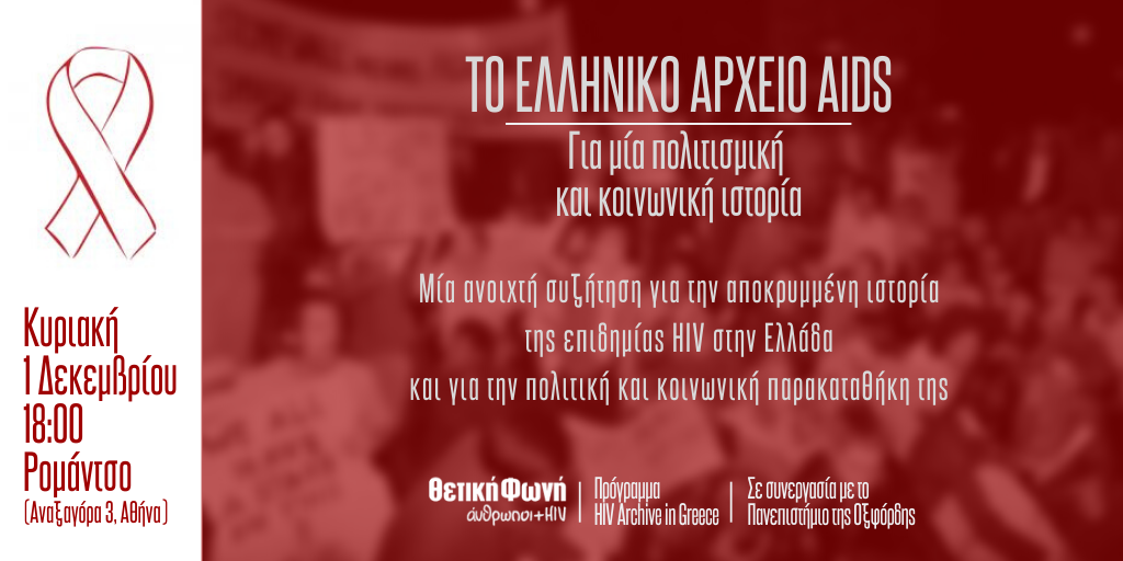 Με αφορμή την Παγκόσμια Ημέρα AIDS, η Θετική Φωνή και το ερευνητικό πρόγραμμα «Ο HIV στην Ελλάδα: Ένα πολιτικό αρχείο», σε συνεργασία με το πανεπιστήμιο της Οξφόρδης, διοργανώνουν την δεύτερη από μια σειρά δημόσιων συζητήσεων και παρεμβάσεων στο πλαίσιο του προγράμματος.