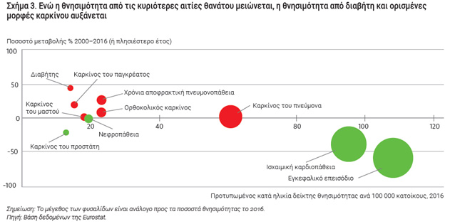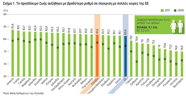 Το προσδόκιμο ζωής στην Ελλάδα εξακολουθεί να υπερβαίνει τον μέσο όρο της ΕΕ, ωστόσο αυξάνεται με πιο αργό ρυθμό σε σύγκριση με πολλές άλλες χώρες της ΕΕ.