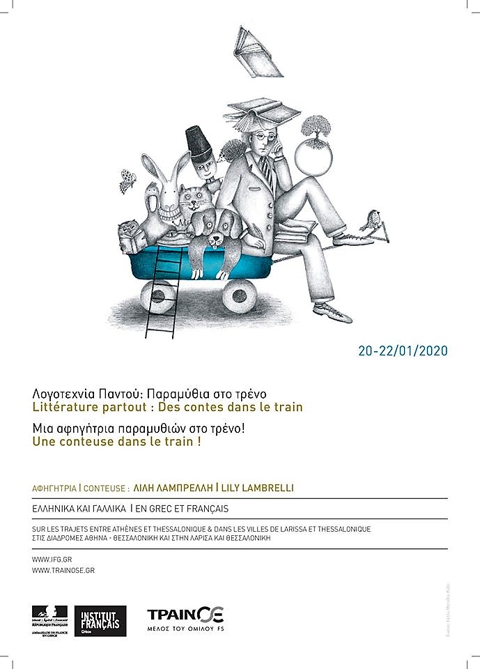 Το τριήμερο 20, 21 και 22 Ιανουαρίου θα μοιραστούμε τέσσερα παραμύθια στο τρένο για Λάρισα και Θεσσαλονίκη και στα παραρτήματα του Γαλλικού Ινστιτούτου στη Λάρισα και στη Θεσσαλονίκη, στα ελληνικά και στα γαλλικά, σε μια ενιαία αφήγηση.