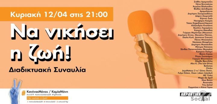 Η σελίδα στο Facebook «Covid19: Κανένας Μόνος / Καμία Μόνη» διοργανώνει σήμερα, Κυριακή 12 Απριλίου, στις 9 το βράδυ, διαδικτυακή συναυλία στην οποία θα συμμετέχουν δεκάδες καλλιτέχνες. Την διαδικτυακή συναυλία θα μπορεί κάποιος να την παρακολουθήσει ζωντανά από τη σελίδα του Facebook.
