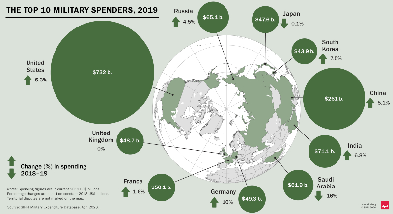 Οι συνολικές στρατιωτικές δαπάνες παγκοσμίως αυξήθηκαν στα 1917 δισεκατομμύρια δολάρια το 2019, σύμφωνα με νέα στοιχεία από το Διεθνές Ινστιτούτο Ειρήνης της Στοκχόλμης (SIPRI). Το σύνολο για το 2019 αντιπροσωπεύει αύξηση 3,6% από το 2018 και τη μεγαλύτερη ετήσια αύξηση των δαπανών από το 2010. Οι πέντε χώρες με τις μεγαλύτερες δαπάνες το 2019, που αντιστοιχούσαν στο 62% των δαπανών, ήταν οι Ηνωμένες Πολιτείες, η Κίνα, η Ινδία, η Ρωσία και Σαουδική Αραβία. Είναι η πρώτη φορά που δύο ασιατικά κράτη έχουν εμφανιστεί μεταξύ των τριών κορυφαίων στρατιωτικών δαπανών.