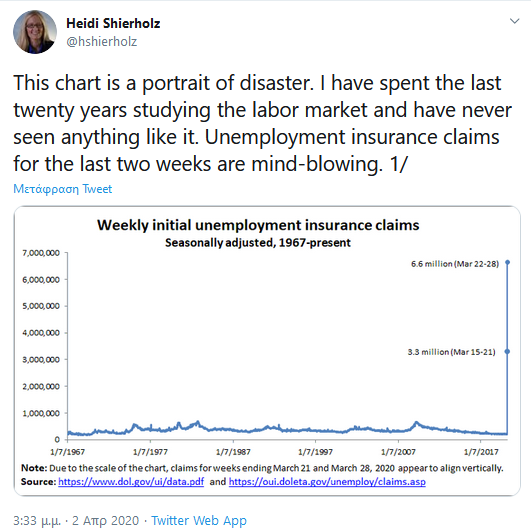 Τα ξέφρενα νούμερα ανεβάζουν το συνολικό αριθμό των αιτήσεων ανεργίας για το μήνα Μάρτιο σε 10,4 εκατομμύρια, ξεπερνώντας τον αριθμό των θέσεων εργασίας που χάθηκαν κατά τη διάρκεια ολόκληρης της μεγάλης ύφεσης του 2007-2009. Τα 6,6 εκατομμύρια νέα αιτήματα ανεργίας είναι περισσότερο από το διπλάσιο από το προηγούμενο ρεκόρ των 3,28 εκατομμυρίων αιτημάτων που είχαν κατατεθεί μόλις την περασμένη εβδομάδα.