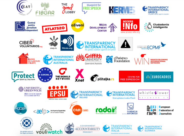 Access Info / African Centre for Media & Information Literacy / APW-Fíltrala / Archiveros Españoles en la Función Pública / Atlatszo / Blueprint for Free Speech / Centre for Free Expression, Ryerson University / Centru Pentru Journalism / CFDT Cadres / Cibervoluntarios / CREW – Greenwich University / Prof. David Lewis, Whistleblowing Research Unit, Middlesex University / ePanstwo Foundation / EPSU – European Public Service Union / Eurocadres – Council of European Professional and Managerial Staff / European Centre for Press and Media Freedom / European Federation of Journalists / European Organisation of Military Associations and Trade Unions / Fundación Ciudadanía Inteligente / Fundación Internacional Baltasar Garzón (FIBGAR) / Funky Citizens / Government Accountability Project / Griffith University / Hermes Center for Transparency and Digital Human Rights / International Bar Association / Maison des Lanceurs D’Alerte / Media Development Center / Oživení / Pistaljka / Protect / Proyecto sobre Organización, Desarrollo, Educación e Investigación (PODER) / Red de Abogados para la Defensa Ambiental / Stefan Batory Foundation / The Ethicos Group / The good lobby / The Signals Network / Tom Mueller / Transparency International / Transparency International Australia / Transparency international Estonia / Transparency International Greece / Transparency International Ireland / Transparency International Italy / Transparency International Slovensko / Dr Vigjilenca Abazi, Maastricht University / Vouliwatch / WIN Whistleblowing International Network / Whistleblower-Network Germany / X-net