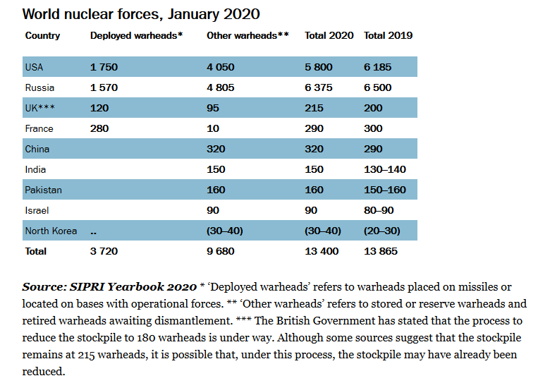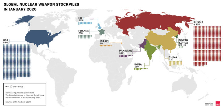Τα εννέα κράτη με πυρηνικά όπλα —οι Ηνωμένες Πολιτείες, η Ρωσία, το Ηνωμένο Βασίλειο, η Γαλλία, η Κίνα, η Ινδία, το Πακιστάν, το Ισραήλ και η Λαϊκή Δημοκρατία της Κορέας (Βόρεια Κορέα)— κατείχαν συνολικά περίπου 13.400 πυρηνικά όπλα στις αρχές του 2020. Αυτό σηματοδότησε μια μείωση από τα 13.865 πυρηνικά όπλα που το SIPRI υπολόγισε ότι αυτά τα κράτη κατείχαν στις αρχές του 2019. Περίπου 3.720 από τα πυρηνικά όπλα έχουν αναπτυχθεί με επιχειρησιακές δυνάμεις και σχεδόν 1.800 από αυτά βρίσκονται σε κατάσταση υψηλής επιχειρησιακής ετοιμότητας.