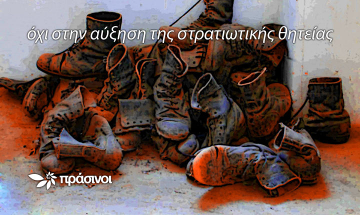 Οι Πράσινοι είναι αντίθετοι, τόσο στην αύξηση της θητείας και την κατάργηση των αναβολών στράτευσης, όσο και στη συνολικότερη επιλογή για έμφαση στην ενίσχυση της στρατιωτικής ισχύος, έστω και με υποθήκευση του μέλλοντος της χώρας. Σε αντίθεση με όλο το πολιτικό σύστημα, οι Πράσινοι επιδιώκουν έναν ουσιαστικό διάλογο για ενίσχυση της ασφάλειας της χώρας και της κοινωνίας σε όλες της τις διαστάσεις αλλά και για κριτική αποτίμηση του ισραηλινού μοντέλου της «χώρας-αστακού», που αρκετοί επιδιώκουν να μεταφέρουν και στην Ελλάδα.