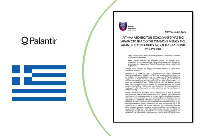 Σήμερα, 17.12.2020, η Homo Digitalis προχώρησε σε μία στρατηγική δράση και κατέθεσε αίτηση ενώπιον του Προέδρου της Αρχής Προστασίας Δεδομένων Προσωπικού Χαρακτήρα (ΑΠΔΠΧ) προκειμένου να ασκήσει η ΑΠΔΠΧ τις εξουσίες έρευνας που διαθέτει και να ρίξει φως στη σύμβαση της Palantir με την Ελληνική Κυβέρνηση.