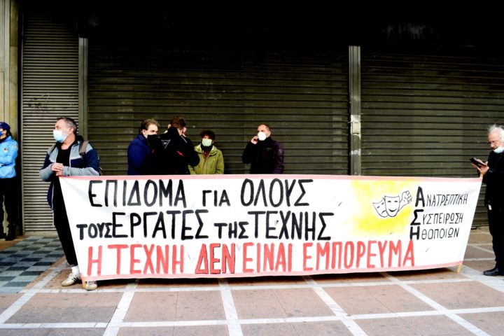 Αντιπροσωπεία των Σωματείων της Πανελλήνιας Ομοσπονδίας Θεάματος Ακροάματος (Π.Ο.Θ.Α.) πραγματοποίησε παράσταση διαμαρτυρίας, τηρώντας όλα τα υγειονομικά μέτρα προστασίας για τον COVID-19 κρατώντας αποστάσεις και φορώντας μάσκα.