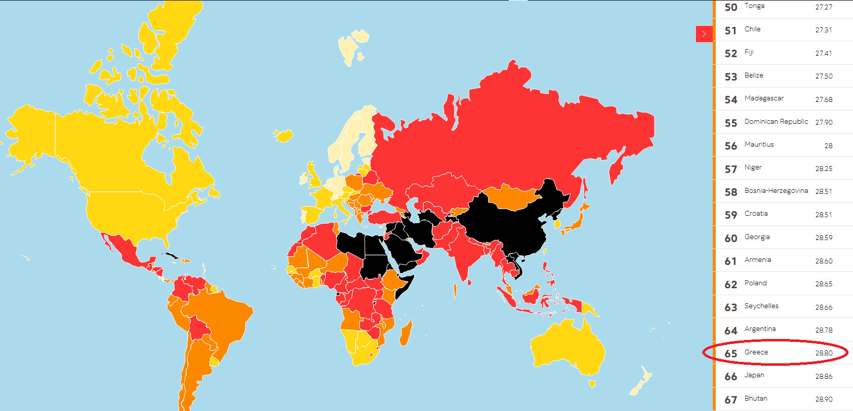 Οι Δημοσιογράφοι χωρίς Σύνορα είναι μια ανεξάρτητη οργάνωση που υπερασπίζεται την ελευθερία στην πληροφόρηση και την ελευθερία της έκφρασης. Κάθε χρόνο δημοσιεύουν την κατάταξη των χωρών σε όλο τον κόσμο με βάση την ελευθερία του Τύπου. Η Ελλάδα για το 2020 βρίσκεται στην 65η θέση, μια πολύ χαμηλή θέση στην παγκόσμια κατάταξη. Στις πρώτες θέσεις βρίσκονται οι χώρες της Σκανδιναβίας.