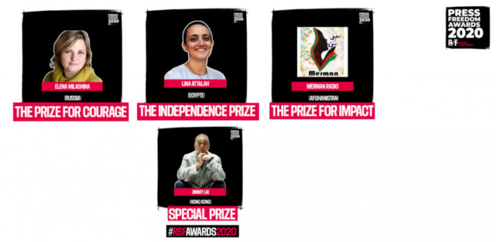 Η τελετή απονομής των βραβείων για την Ελευθερία του Τύπου 2020 των Δημοσιογράφων χωρίς Σύνορα πραγματοποιήθηκε στις 8 Δεκεμβρίου στην Ταϊπέι της Ταϊβάν. Στη Ρωσίδα δημοσιογράφο Ελένα Μιλάσινα απονεμήθηκε το Βραβείο Θάρρους, στον αφγανικό ραδιοφωνικό σταθμό Merman απονεμήθηκε το Βραβείο Επιρροής και στην Αιγύπτια συντάκτρια Λίνα Αταλάχ δόθηκε το Βραβείο Ανεξαρτησίας. Ένα ειδικό βραβείο απονεμήθηκε στον ιδρυτή της Apple Daily του Χονγκ Κονγκ, Τζίμι Λάι.