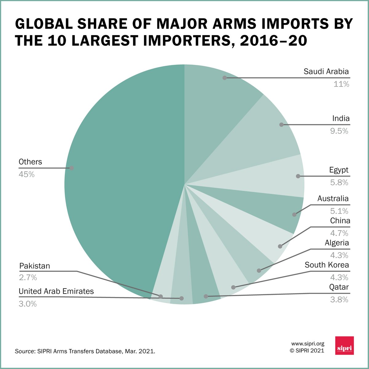 Για πρώτη φορά από την πενταετία 2001-2005, ο όγκος των μεγάλων όπλων που παραδόθηκαν μεταξύ των χωρών δεν αυξήθηκε μεταξύ 2011-15 και 2016-20. Ωστόσο, οι διεθνείς μεταφορές όπλων παραμένουν κοντά στο υψηλότερο επίπεδο από το τέλος του ψυχρού πολέμου.