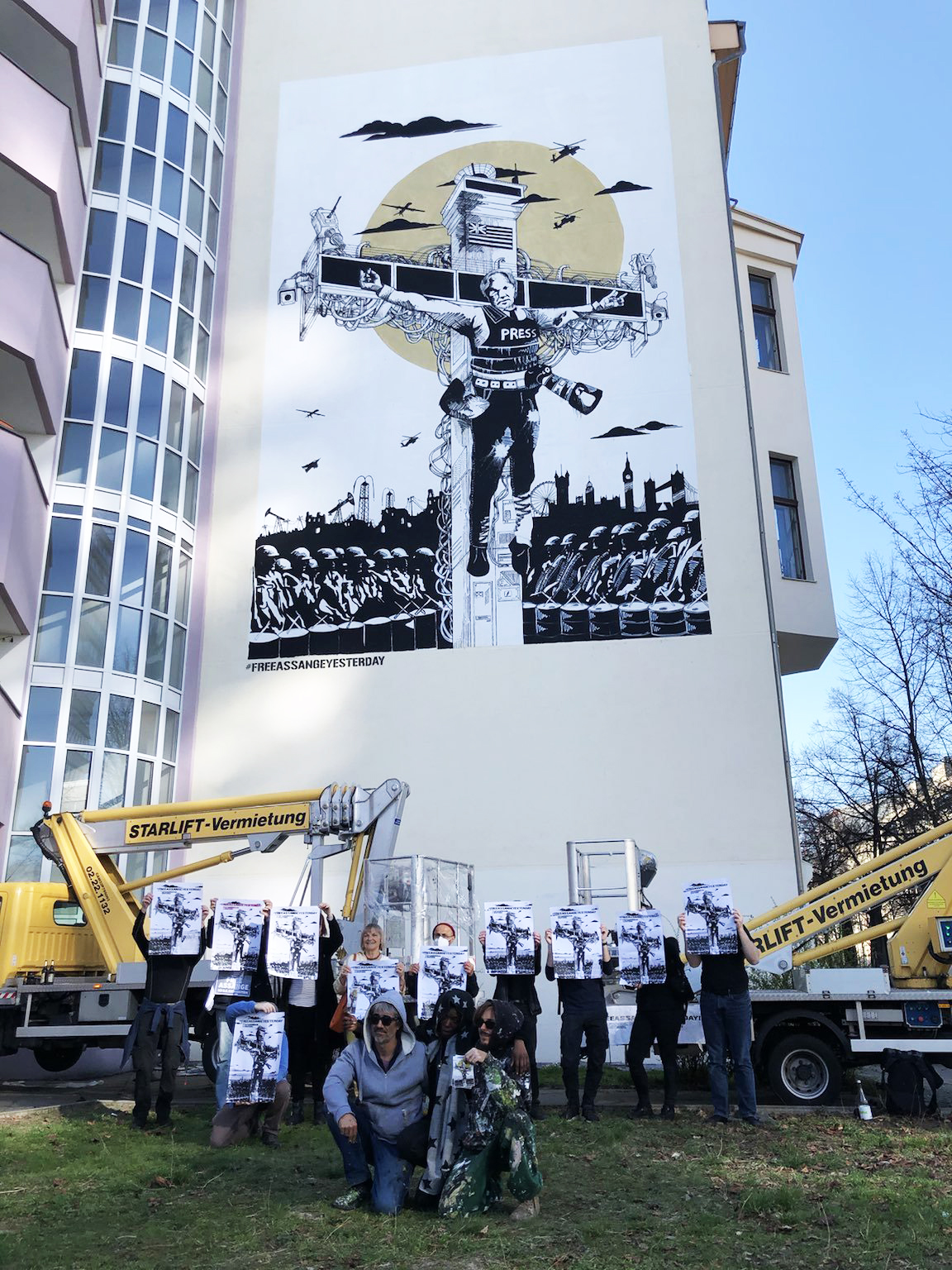 Με τον τίτλο “Collateral Crucifixion” (παράπλευρη σταύρωση), το καλλιτεχνικό δίδυμο Captain Borderline ολοκλήρωσε το σχέδιο μιας γιγαντιαίας τοιχογραφίας του Ασάνζ στο Βερολίνο σε ολόκληρη την πρόσοψη ενός κτιρίου ακριβώς μπροστά από το Willy Brandt Haus* τη Μεγάλη Εβδομάδα των Καθολικών.