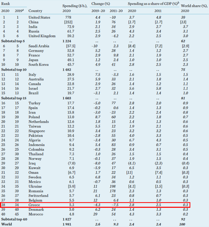 Η Ελλάδα βρίσκεται στην 38η θέση στην παγκόσμια κατάταξη το 2020 με 5,3 δισ. δολάρια (4,65 δισ. ευρώ) να πηγαίνουν σε στρατιωτικές δαπάνες. Οι ελληνικές στρατιωτικές δαπάνες μειώθηκαν σε πραγματικούς αριθμούς κατά 4,3 τοις εκατό σε σχέση με το 2019, αλλά αυξήθηκαν ως ποσοστό επί του ΑΕΠ φτάνοντας το 2,8 τοις εκατό. Η κατά κεφαλήν δαπάνη ανέρχεται στα 508,6 δολάρια το 2020.