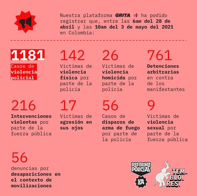 Μετά από τέσσερις ημέρες διαδηλώσεων, πραγματοποιήθηκαν περισσότερες από 851 κατασταλτικές ενέργειες αστυνομικής βίας σε διάφορες πόλεις της χώρας, μεταξύ του διημέρου 28 και 30 Απριλίου, σύμφωνα με όσα ανέφερε η μη κυβερνητική οργάνωση Temblores, στις 2 Μαΐου 2021. Επιπλέον, οργανώσεις όπως Το Δίκτυο Ανθρωπίνων Δικαιωμάτων του Francisco Isaías στο Cali, μία από τις πόλεις με τις περισσότερες και μαζικότερες συγκεντρώσεις, ανέφερε ότι έλαβε καταγγελία για 14 άτομα που σκοτώθηκαν από πυροβολισμούς της αστυνομίας. Προς το παρόν έχουν επιβεβαιωθεί 7 δολοφονίες και άλλες 7 ερευνούνται.