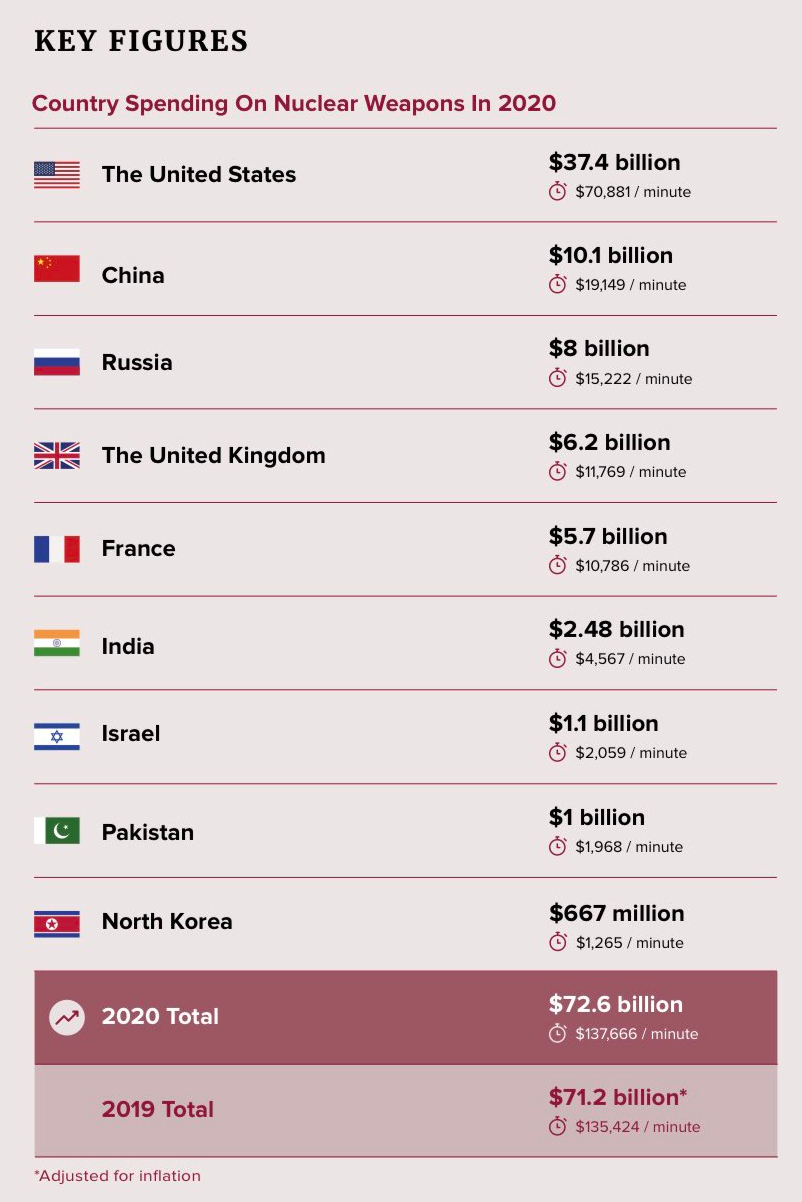 Σύμφωνα με νέα έκθεση της Διεθνούς Εκστρατείας για την Κατάργηση των Πυρηνικών Όπλων, ICAN, οι δαπάνες για τα πυρηνικά όπλα αυξήθηκαν κατά 1,4 δισ. δολάρια το 2020. Καθώς η πανδημία απλωνόταν σε όλο τον πλανήτη, οι εννέα χώρες που κατέχουν πυρηνικά όπλα δαπάνησαν συνολικά 72,6 δισ. δολάρια για τα πυρηνικά τους όπλα, ποσό που αντιστοιχεί σε 137.666 δολάρια κάθε λεπτό. Η έκθεση «Complicit: 2020 Global Nuclear Weapons Spending» (Συνένοχος: Παγκόσμιες Δαπάνες για τα Πυρηνικά Όπλα 2020) καταγράφει τις δαπάνες αυτών των εννέα κρατών για τα οπλοστάσιά τους, τις εταιρείες που κερδοσκοπούν και τους λομπίστες που προσλαμβάνουν.