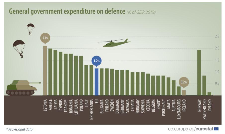 Στοιχεία των εξόδων άμυνας των χωρών-μελών της Ευρωπαϊκής Ένωσης για το έτος 2019 εξέδωσε η Eurostat, σύμφωνα με τα οποία η Ελλάδα βρέθηκε για άλλη μία χρονιά στις πρώτες θέσεις, ξοδεύοντας 2% του ΑΕΠ της.