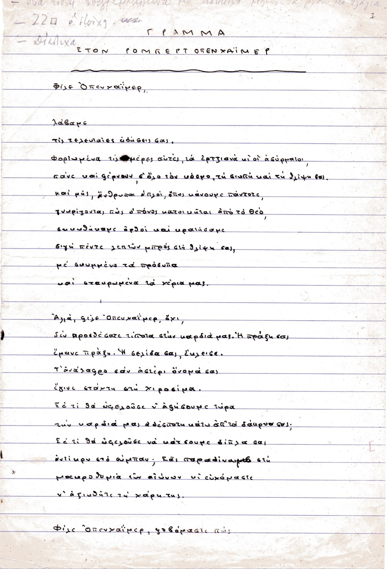 Στα 1954 ο Ρόμπερτ Οππενχάϊμερ ο σοφός κατασκευαστής της ατομικής βόμβας, βασανίζεται από τρομαχτικές τύψεις. «Εγώ έγινα ο θάνατος, εγώ έγινα η καταστροφή» μονολογεί. Δηλαδή έγινε η αρχή της καταστροφής, γιατί τα μέσα της καταστροφής τελειώνονται και η ενδεχόμενη καταστροφή θα μπορούσε να προβλέψει κανείς πως δε θάφηνε πάνω στον πλανήτη μας την ευθύνη να μονολογεί. Έγραψα το ποίημα «στον Ρόμπερτ Οππενχάϊμερ». Το θέμα βγήκε από μέσα μου. Έχασα κάμποσα κιλά από το βάρος μου στο διάστημα αυτού του διαλόγου, που, άσχετα με το τι βγήκε το ποίημα, μέσα μου ήταν σπαραχτικός. Εκείνες τις ημέρες η φωτογραφία του μας κοιτούσε συμπαθητικά απ’ όλες τις εφημερίδες. Εγώ γράφοντας, είχα μπροστά μου μια έγχρωμη φωτογραφία του -στο εξώφυλλο των βδομαδιάτικων «Τάϊμς» της Νέας Υόρκης- που έδειχνε το πρόσωπό του ποτισμένο από βαθειά θλίψη. Νόμιζα πως τόσο λυπημένο πρόσωπο δεν είχα ξαναδεί στη ζωή μου. Και νομίζω πως τόση κατανόηση και τόση αγάπη, δεν έχω δείξει ποτέ για καμμιά άλλη θλίψη. Τον κοιτούσα ωστόσο και τον κατηγορούσα με πάθος. Κι’ επειδή η συγνώμη δεν ήταν στο χέρι μου, κατηγόρησα και τον εαυτό μου για να μην τον πικράνω και, δεν αποκλείεται, μπορεί δίκαια και αυτόν να τον κατηγόρησα. Γράφοντάς το., ήξερα ποια ήταν η αρχή αυτού του ποιήματος. Στην ίδια μελέτη που είχα γράψει για το φως, μιλούσα και για τη δύναμη που θα παραγόταν αν μπορούσε να διασπαστεί ένα άτομο της ύλης. Και με τη βοήθεια της δύναμης αυτής, ονειρευόμουνα την ανθοφορία του κόσμου, κι’ όχι την καταστροφή της Χιροσίμα ή του ίδιου του κόσμου. Το θέμα βγήκε απ’ αυτή την παιδική πληγή.