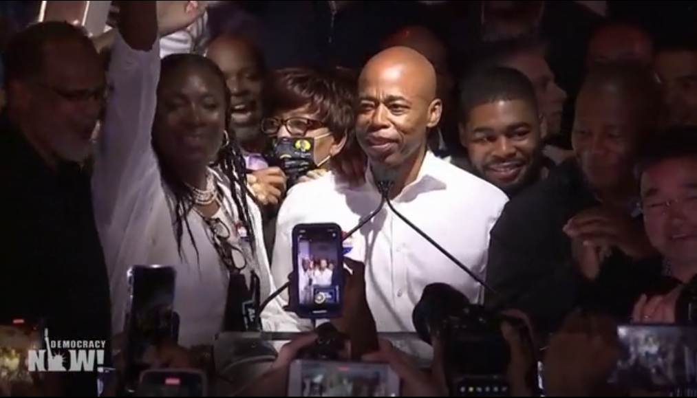 Το όνομά του είναι Έρικ Λιρόυ Άνταμς, στηρίχθηκε από το Δημοκρατικό Κόμμα και από την 1η Ιανουαρίου του 2022 ξεκινά τα καθήκοντά του ως Δήμαρχος της Νέας Υόρκης. Το σύνθημά του ήταν “Είμαι εσείς”. Με αυτόν τον τρόπο ένωσε πολλαπλές προσωπικότητες στον προεκλογικό του αγώνα, χωρίς να προάγει ένα συγκεκριμένο προφίλ. Αναφέρθηκε με σχετική ασάφεια προεκλογικά στον πολιτικό χώρο που υποστηρίζει, λέγοντας ότι είναι πραγματιστής αλλά και αληθινά προοδευτικός. Δείπνησε με τους ιδιοκτήτες των σημαντικότερων Μέσων Ενημέρωσης και αν και Δημοκρατικός, η νίκη του έτυχε θετικότατης υποδοχής από την δεξιόστροφη New York Post. Υποσχέθηκε ότι θα πατάξει την εγκληματικότητα. Ισχυρίζεται ότι κάνει αφρόλουτρα με τριαντάφυλλα και ότι θα κρατούσε πιστόλι στην εκκλησία. Είναι έγχρωμος και έχει συνταξιοδοτηθεί ως αρχηγός της αστυνομίας της πόλης της Νέας Υόρκης (στο Μπρούκλιν).