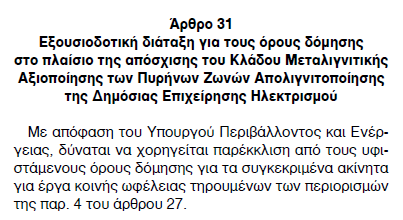 Σε ό,τι αφορά τα εδάφη των ορυχείων, το άρθρο 27 απαλλάσσει τη ΔΕΗ από την αποκατάσταση τους, παρότι η ευθύνη και το συνακόλουθο κόστος ανήκε στην εταιρεία. Η ΔΕΗ ωστόσο είναι πλέον ιδιωτική εταιρεία! Η απαλλαγή της από ένα κόστος που έφερε στους ισολογισμούς της επί δεκαετίες ισοδυναμεί με οικονομικό σκάνδαλο που αναπαράγει το γνωστό σχήμα του αρπακτικού νεοφιλελευθερισμού: τα κέρδη στις εταιρείες και το κόστος στους πολίτες και δη στο Ταμείο Ανάκαμψης και Ανθεκτικότητας μιας και το κόστος αποκατάστασης που εκτιμάται σε 300 εκ. ευρώ μεταφέρθηκε στους κωδικούς του. Η σκανδαλώδης εύνοια απέναντι στην ανώνυμη εταιρεία, ιδιωτική κατά 76%, ΔΕΗ περιλαμβάνει επίσης το δικαίωμα να καθορίζει μονομερώς τους συντελεστές δόμησης και τους όρους χρήσης κατά παράβαση των ισχυόντων. Η ΔΕΗ έτσι αποκτά δικαιώματα χωροταξίας!