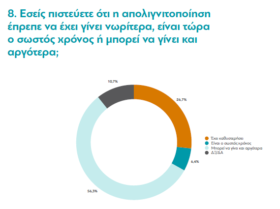 Το σχέδιο απολιγνιτοποίησης παρά τα κοσμητικά, επευφημιστικά επίθετα με τα οποία το έχουν στολίσει (δίκαιη, αναπτυξιακή, κ.λπ., κ.λπ.), δεν έχει την έγκριση των τοπικών κοινωνιών. Βάσει έρευνας που δημοσίευσε το Νοέμβριο του 2020 η υπεράνω πάσης υποψίας Διανέοσις, με τη βοήθεια της δημοσκοπικής Marc, το 56,3% των κατοίκων των πληττόμενων περιοχών απαντά ότι η απολιγνιτοποίηση μπορεί να καθυστερήσει. Ειδικότερα, την άποψη ότι το κλείσιμο των λιγνιτικών μονάδων μπορεί να γίνει και αργότερα υποστηρίζει το 49,5% των κατοίκων της Περιφερειακής Ενότητας (ΠΕ) Αρκαδίας, το 56,3% των κατοίκων της ΠΕ Φλώρινας και το 64,5% των κατοίκων της ΠΕ Κοζάνης.