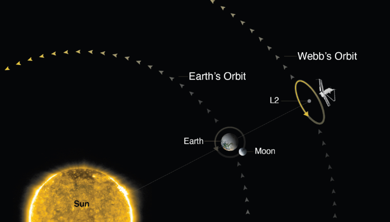 Διατηρώντας αυτήν την τροχιά το Webb στη μία του πλευρά με την ηλιακή ασπίδα θα βλέπει πάντα τον Ήλιο, τη Γη και τη Σελήνη, εμποδίζοντας τη θερμότητά και το φως τους από το να φτάνουν στα ευαίσθητα όργανα του τηλεσκοπίου, ώστε να μπορεί να παρατηρεί την υπέρυθρη ακτινοβολία. Μετά από έναν μήνα το τηλεσκόπιο θα φτάσει στον προορισμό του, στο δεύτερο σημείο Lagrange (L2), μία από τις πέντε θέσεις στο διάστημα όπου η βαρυτική έλξη του Ήλιου και της Γης ισορροπούν με την κεντρομόλο δύναμη που απαιτείται για να κινηθεί ένα διαστημόπλοιο μαζί τους. Έτσι, τα σημεία Lagrange είναι ιδιαίτερα χρήσιμα για τη μείωση του καυσίμου που απαιτείται για να παραμείνει ένα διαστημόπλοιο στη θέση του. Η τοποθεσία επιτρέπει επίσης τη συνεχή επικοινωνία με το Webb μέσω του Deep Space Network, μιας διεθνούς σειράς γιγαντιαίων κεραιών που διαχειρίζεται το Εργαστήριο Αεριοπροώθησης της NASA.