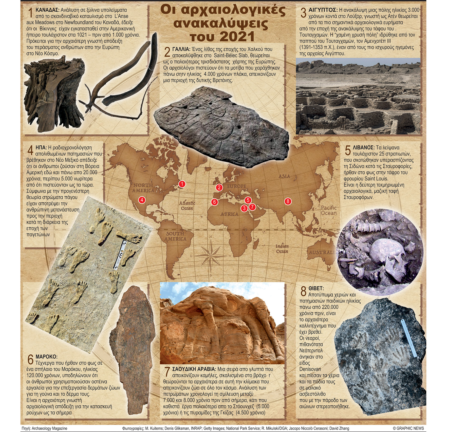 Οι πιο αξιοσημείωτες αρχαιολογικές ανακαλύψεις του κόσμου το 2021 περιλαμβάνουν τη χαμένη χρυσή πόλη της Αιγύπτου, τα παλαιότερα ανθρώπινα ίχνη στη Βόρεια Αμερική, το παλαιότερο έργο τέχνης του κόσμου που βρέθηκε στο Θιβέτ και τον παλαιότερο χάρτη που έχει βρεθεί ποτέ στην Ευρώπη. Graphic