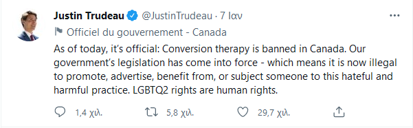 Στις 7 Ιανουαρίου ο Πρωθυπουργός του Καναδά, Τζαστίν Τρουντό, απαγόρευσε τις θεραπείες μεταστροφής ΛΟΑΤΚΙ+ προσώπων. Πρόκειται για την προσπάθεια αλλαγής του σεξουαλικού προσανατολισμού ή/και της ταυτότητας φύλου ενός προσώπου με τη χρήση κάποιας μορφής βίας (φυσικής, ψυχολογικής, θρησκευτικής) που εξασκείται από την οικογένεια, με τη βοήθεια συνήθως κάποιου “ειδικού” γιατρού, πνευματικού, ψυχολόγου ή άλλου εναλλακτικού θεραπευτή. Στο τουίτερ ο Καναδός Πρωθυπουργός κάνει σαφές ότι στην Καναδική κοινωνία αυτές οι προσπάθειες πλέον είναι παράνομες.