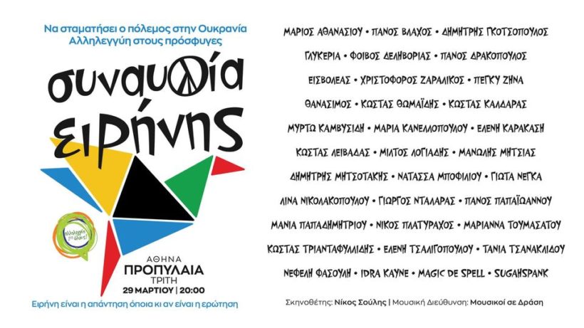 Η συλλογικότητα “Αλληλεγγύη για όλους” διοργανώνει μεγάλη συναυλία για την ειρήνη, την ερχόμενη Τρίτη 29 Μαρτίου, στις 20:00, στα Προπύλαια, με τη συμμετοχή πολλών καλλιτεχνών. Σκηνοθετεί ο Νίκος Σούλης και την καλλιτεχνική διεύθυνση έχουν αναλάβει οι Μουσικοί σε Δράση.