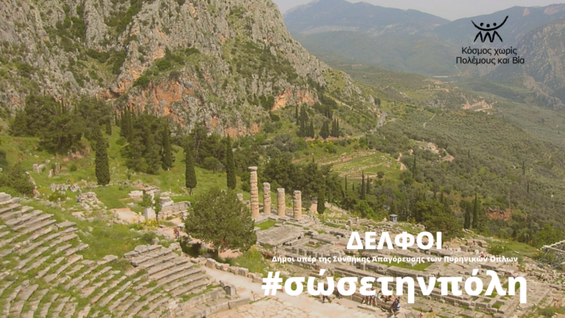 Ο δήμος Δελφών, ένας δήμος με ιστορική και διεθνή σημασία, με την απόφαση του Δημοτικού Συμβουλίου αρ. 44/21-3-2022, έγινε ο έκτος δήμος που υποστηρίζει την εκστρατεία του Κόσμου Χωρίς Πολέμους και Βία, #σώσετηνπόλη. Προστίθεται έτσι στην μεγάλη οικογένεια δήμων σε όλο τον κόσμο, που καλούν τις κυβερνήσεις τους να υπογράψουν και να επικυρώσουν την Συνθήκη Απαγόρευσης των Πυρηνικών όπλων. Δηλώνει παρών στην προσπάθεια για την δημιουργία ενός δικτύου Δήμων που επιθυμούν ένα μέλλον χωρίς την απειλή ενός πυρηνικού ολοκαυτώματος για τους πολίτες τους και τους πολίτες όλου του κόσμου.