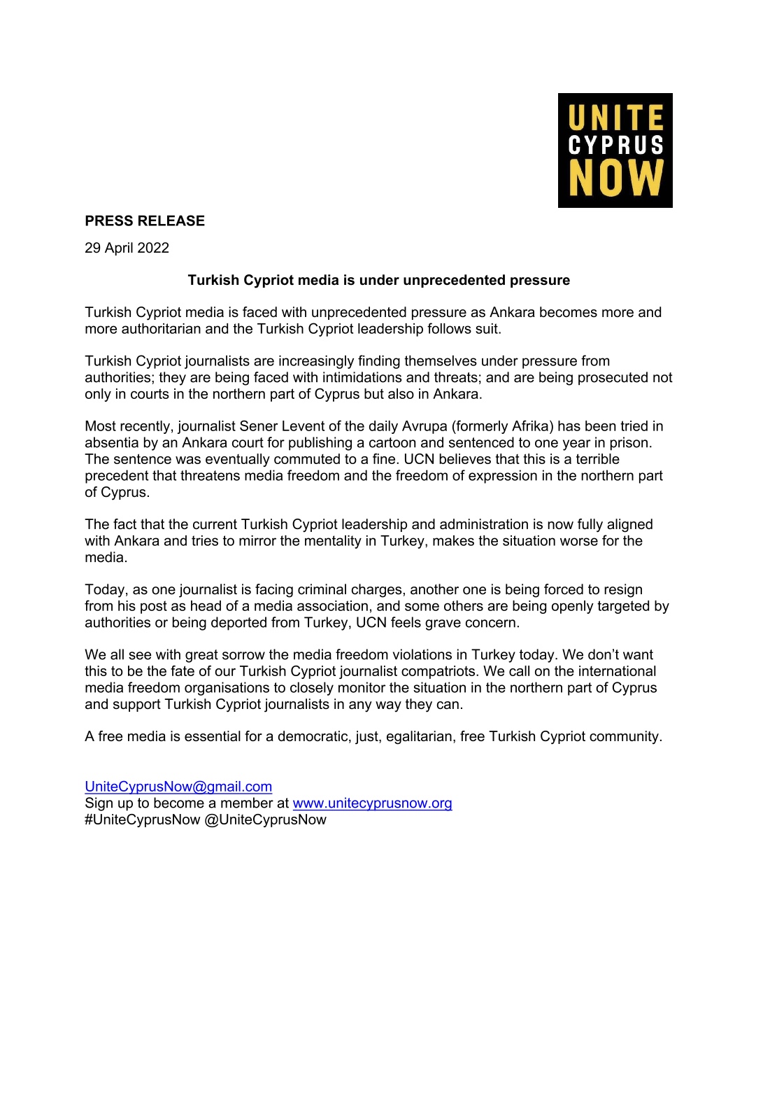 Σύμφωνα με δελτίο τύπου που δημοσίευσε η οργάνωση unitecyprusnow στις 29 Απριλίου, τα τουρκοκυπριακά μέσα ενημέρωσης και οι δημοσιογράφοι βρίσκονται υπό συνεχή πίεση, δεδομένης της προοδευτικά αυξανόμενης απολυταρχικής στάσης της Άγκυρας. Απειλές, πιέσεις για παραιτήσεις δημοσιογράφων και δικαστικές διώξεις, όχι μόνο στην τουρκική πλευρά της Κύπρου αλλά και στην Τουρκία, είναι μερικές από τις εξελίξεις το τελευταίο διάστημα.