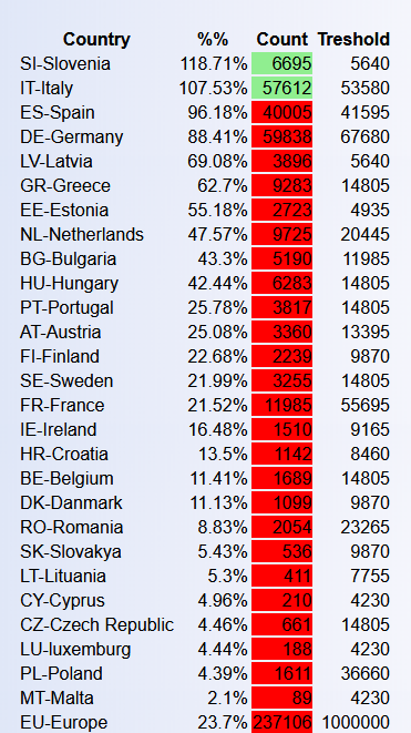 Η ΕΠΠ συγκέντρωσε μέσα σε ενάμιση περίπου χρόνο 237.000 υπογραφές από όλη την ΕΕ. Η Σλοβενία ήταν η πρώτη που έφτασε το κατώτατο όριο υπογραφών, ενώ ακολούθησε η Ιταλία πριν λίγες μέρες. Τρίτη στην κατάταξη βρίσκεται η Ισπανία έχοντας φτάσει το 96% των απαιτούμενων υπογραφών, ενώ η Ελλάδα βρίσκεται στην 6η θέση έχοντας το 62,7% των απαιτούμενων υπογραφών και χρειάζεται άλλες 5.500 υπογραφές για να τις φτάσει.