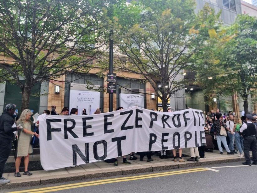 «Να παγώσει το κέρδος όχι οι άνθρωποι» γράφει πανό του βρετανικού «Δεν Πληρώνω» που ξεπήδησε τις τελευταίες βδομάδες ως απάντηση στην τρομακτική κατάσταση των εξωφρενικών τιμών οικιακών λογαριασμών ρεύματος.