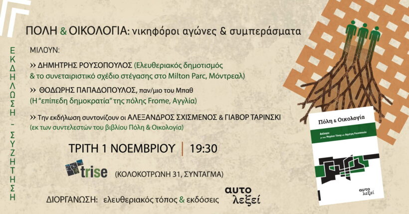 Με αφορμή τα πολιτικά ζητήματα που ανοίγονται στο βιβλίο του Αυτολεξεί «Πόλη & Οικολογία, Διάλογοι με τους Μπράιαν Τόκαρ και Δημήτρη Ρουσόπουλο» και την άφιξη αγαπημένων συνομιλητών στην Αθήνα, σας καλούμε στην εκδήλωση-συζήτηση: «Πόλη & Οικολογία: νικηφόροι αγώνες και συμπεράσματα»