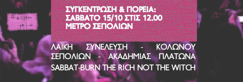 Ως Sabbat-burn the rich not the witch μαζί με την Λαϊκή Συνέλευση Κολωνού, Σεπολίων, Ακαδημίας Πλάτωνα καλούμε σε συγκέντρωση και πορεία το Σάββατο σε αλληλεγγύη με το 12χρονο κορίτσι που κακοποιήθηκε συστηματικά στα χέρια του 53χρονου επιχειρηματία. Να παρθούν τώρα μέτρα για την προστασία και την ψυχοοικονομικη στήριξη του παιδιού και της οικογενειάς του.