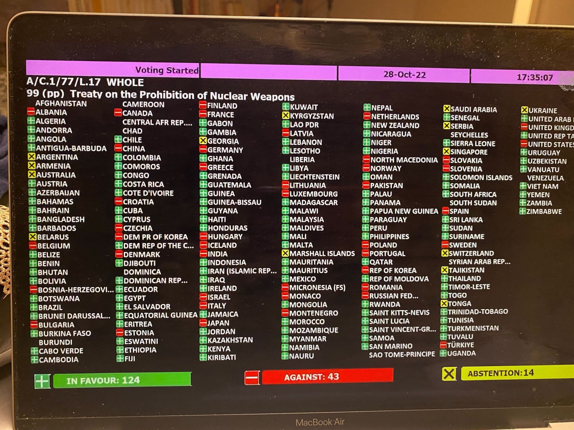 Στις 29 Οκτωβρίου, υπήρξε μια μικρή αριθμητικά, αλλά σημαντική αλλαγή, στο ψήφισμα της Γενικής Συνέλευσης του ΟΗΕ, για την Συνθήκη Απαγόρευσης των Πυρηνικών Όπλων.