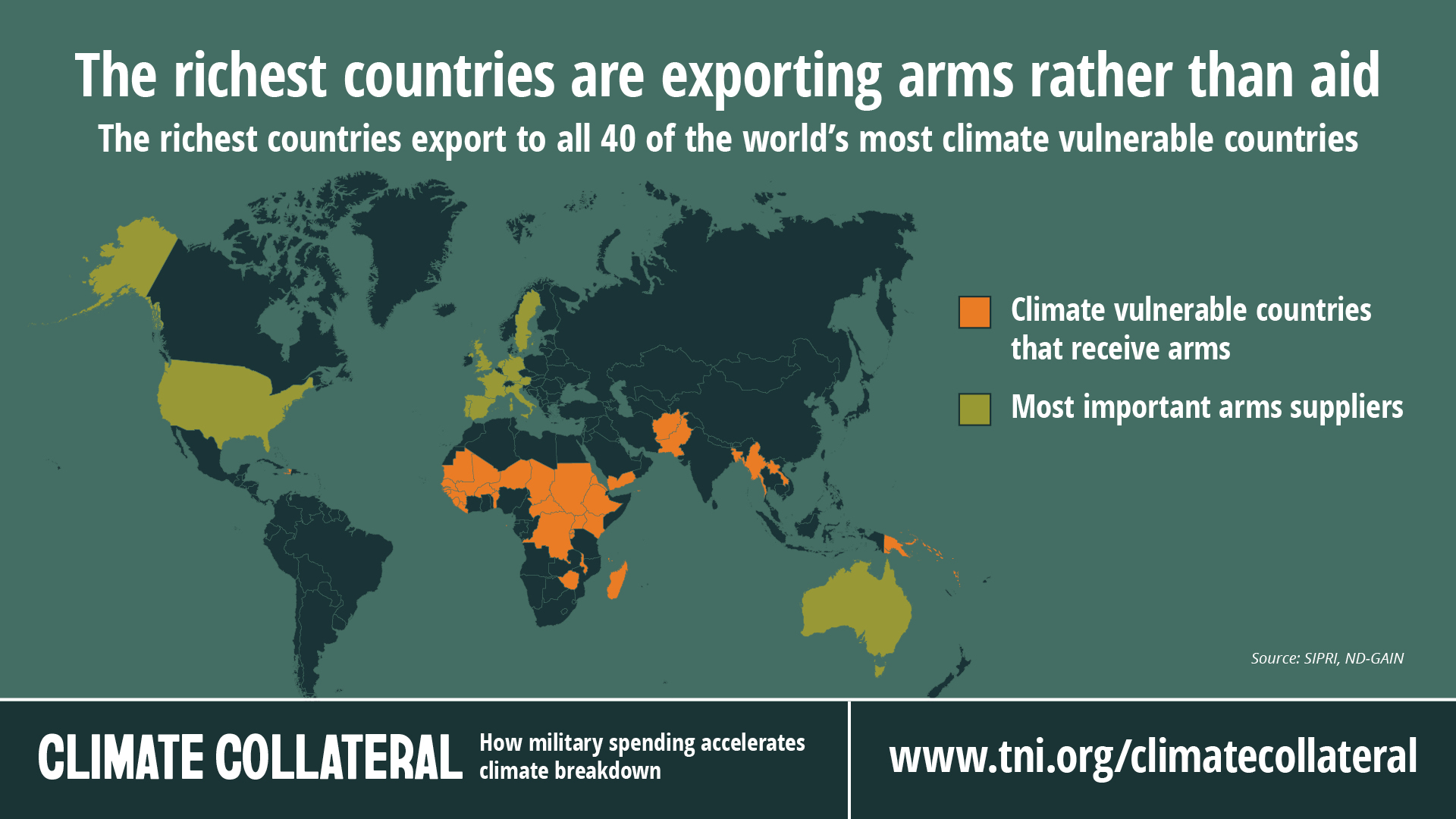 Οι πλουσιότερες χώρες εξάγουν στρατιωτικούς εξοπλισμούς αντί για βοήθεια. Οι πλουσιότερες χώρες εξάγουν και στις 40 χώρες που είναι οι πιο ευάλωτες στην κλιματική αλλαγή. Με πορτοκαλί οι ευάλωτες χώρες που λαμβάνουν όπλα. Με πράσινο οι πιο σημαντικοί προμηθευτές όπλων.