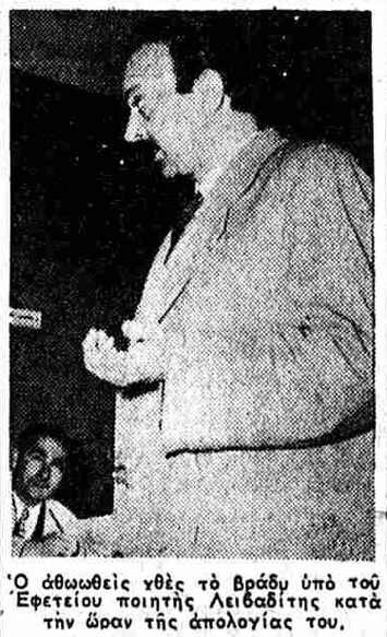 Η λογοκρισία τη δεκαετία του 1950 στην Ελλάδα εκδηλώνεται ποικιλοτρόπως. Ο,τιδήποτε μπορεί να προκαλέσει τη συντηρητική τάξη πραγμάτων δαιμονοποιείται αγγίζοντας χορδές αντικομμουνιστικές και χρηστών ηθών. Τα εθνικο-πατριαρχικά αντανακλαστικά έχουν «ευαισθησίες» απέναντι σε γράμματα και τέχνες. Έτσι – ανάμεσα σε άλλες υποθέσεις – θα βρεθεί υπόλογος στην Δικαιοσύνη και ο ποιητής Τάσος Λειβαδίτης (1922-1988). Πιο συγκεκριμένα, η υπόθεση Λειβαδίτη εκδικάζεται τον Φεβρουάριο του 1955 στο Πενταμελές Εφετείο Αθηνών. Ο ποιητής είναι τότε 33 χρονών με πολιτική δραστηριότητα που ανέπτυξε στο χώρο της αριστεράς τα προηγούμενα χρόνια. Έχει παντρευτεί και έχει μια μικρή κόρη όταν θα συλληφθεί και εξοριστεί από το 1948 μέχρι το 1951 στον Μούδρο, στη Μακρόνησο και στον Αϊ Στρατή απ’ όπου θα μεταφερθεί στις φυλακές Χατζηκώστα στην Αθήνα πριν αφεθεί ελεύθερος υπό ένα καθεστώς ιδιότυπης ομηρίας: οι αστυνομικές αναφορές τον χαρακτηρίζουν «αμετανόητο κομμουνιστή» και τον παρακολουθούν ενώ η άδεια αποφυλάκισης πρέπει να ανανεώνεται κάθε τόσο με αποφάσεις του υπουργείου Εσωτερικών. Πάντως μέσα στα επόμενα χρόνια, η λογοτεχνική φήμη του -με το έργο του κερδίζει πολλούς ανθρώπους- εν μέρει θα τον προστατέψει. Αργότερα στη Μεταπολίτευση θα τον αποκαλούν ποιητή του έρωτα και της επανάστασης.