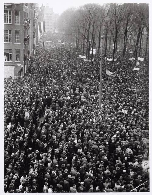 Στη φωτογραφία, είναι η πρώτη τέτοια μέρα μνήμης στο Άμστερνταμ, το 1946. Μια γενική απεργία στη μνήμη εκείνης της μοναδικής του 1941. Αν η Μιεν τεν Νταμ Πούτερς είχε επιζήσει ως τότε, το ξέρω πως είναι κάπου μέσα στη φωτογραφία.