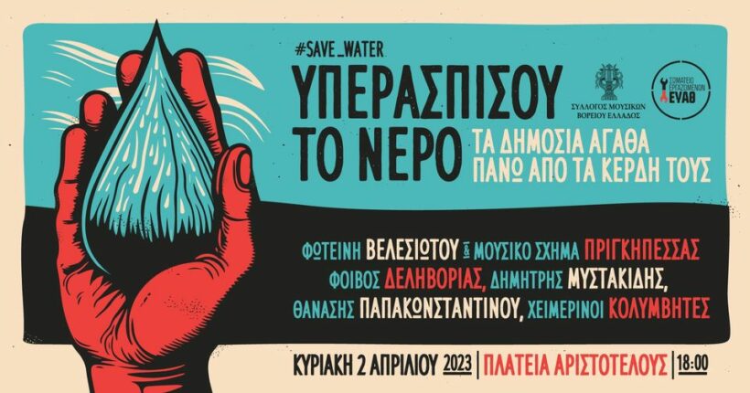 Με το σύνθημα «Υπερασπίσου το Νερό» η Φωτεινή Βελεσιώτου και το μουσικό σχήμα Πριγκηπέσσα, ο Φοίβος Δεληβοριάς, ο Δημήτρης Μυστακίδης, ο Θανάσης Παπακωνσταντίνου και οι Χειμερινοί Κολυμβητές ενώνουν τις φωνές τους σε μια μοναδική ανοιχτή συναυλία, την Κυριακή 2 Απριλίου 2023 στις 18:00 στην Πλατεία Αριστοτέλους της Θεσσαλονίκης. Τη συναυλία διοργανώνει το Σωματείο Εργαζομένων της ΕΥΑΘ, με την υποστήριξη του Συλλόγου Μουσικών Βορείου Ελλάδος, στοχεύοντας στην ευαισθητοποίηση των πολιτών απέναντι στην επερχόμενη ιδιωτικοποίηση του νερού.
