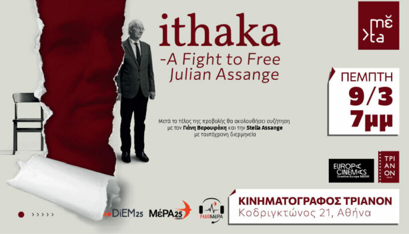 Είναι, για αυτό τον λόγο, που στο πλαίσιο του mέta-cinema θα προβληθεί την ερχόμενη Πέμπτη 9 Μαρτίου στις 7 μ.μ. στον κινηματογράφο “Τριανόν” (Κοδριγκτώνος 21, Αθήνα 104 34), με ελεύθερη είσοδο η ταινία Ithaka – A Fight to Free Julian Assange (2021) του Ben Lawrence.