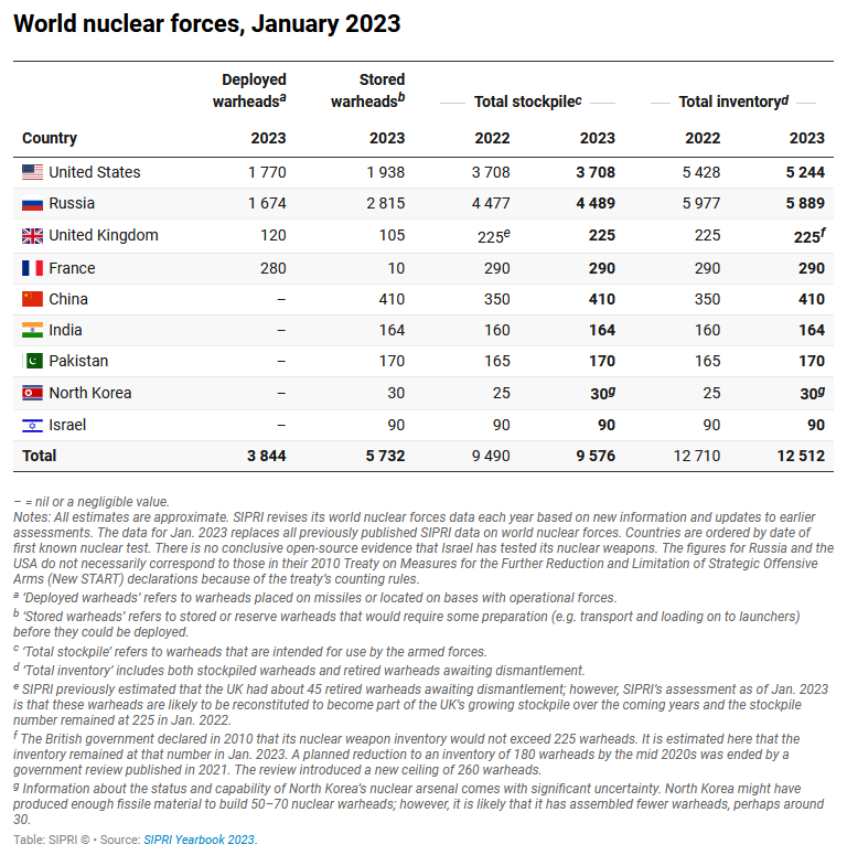 Από το συνολικό παγκόσμιο απόθεμα των περίπου 12.512 πυρηνικών κεφαλών που εκτιμάται ότι υπήρχαν τον Ιανουάριο του 2023, περίπου 9.576 βρίσκονταν σε στρατιωτική ετοιμότητα για πιθανή χρήση –86 περισσότερες από ό,τι τον Ιανουάριο του 2022 (βλ. τον παρακάτω πίνακα). Από αυτές, εκτιμάται ότι 3.844 κεφαλές ήταν ανεπτυγμένες σε πυραύλους και αεροσκάφη και περίπου 2.000 -σχεδόν όλες ανήκαν στη Ρωσία ή στις ΗΠΑ- διατηρούνταν σε κατάσταση υψηλού επιχειρησιακού συναγερμού, πράγμα που σημαίνει ότι ήταν τοποθετημένες σε πυραύλους ή κρατούνταν σε αεροπορικές βάσεις που φιλοξενούσαν πυρηνικά βομβαρδιστικά.