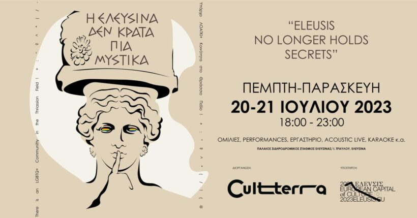 Όχι άλλο κρυφτό και όχι άλλο στην αφάνεια. Αυτά διαβάζω στο δελτίο τύπου που έστειλε η ομάδα cultterra, που για δεύτερη συνεχόμενη χρονιά ανέλαβε να διοργανώσει διήμερες εκδηλώσεις υπερηφάνειας στην πόλη της Ελευσίνας. Με ένα ευφάνταστο σλόγκαν – Η Ελευσίνα δεν κρατάει πια μυστικά – και μια πανέμορφη αφίσα γεμάτη συμβολισμούς, που επιμελήθηκε ο Γιάννης Παπαπέτρου, τα άτομα της ομάδας απαντούν στο ερώτημα: “Μα, υπάρχει ΛΟΑΤΚΙ+ κοινότητα στο Θριάσιο Πεδίο;” δημιουργώντας έξω από την ασφαλή ζώνη του κάθε ΛΟΑΤΚΙ+ ατόμου ένα ανοιχτό πλαίσιο ασφάλειας και αποδοχής. Και ζητώντας μας να το στηρίξουμε με την παρουσία και τη συμμετοχή μας.