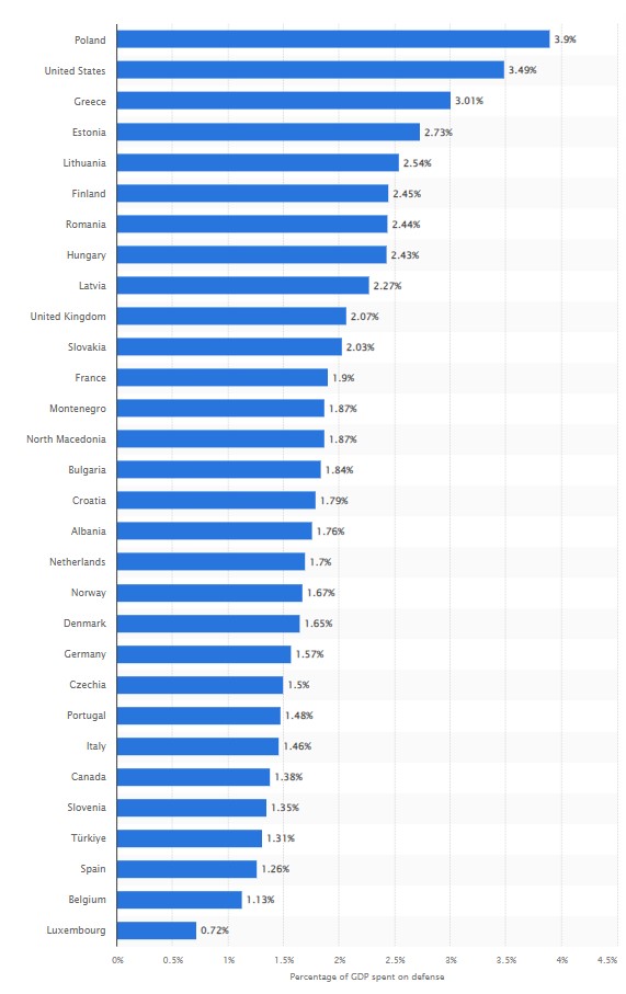 Από την άλλη, οι ΗΠΑ όλο και πιο έντονα απαιτούν οι ευρωπαϊκές χώρες να αφιερώνουν το 2% του ΑΕΠ τους σε πολεμικές δαπάνες. Κάτι σαν «προστασία» που πρέπει να καταβάλλουν οι ευρωπαϊκές χώρες στον αμερικάνο αδελφό και δη στο στρατιωτικοβιομηχανικό σύμπλεγμα.