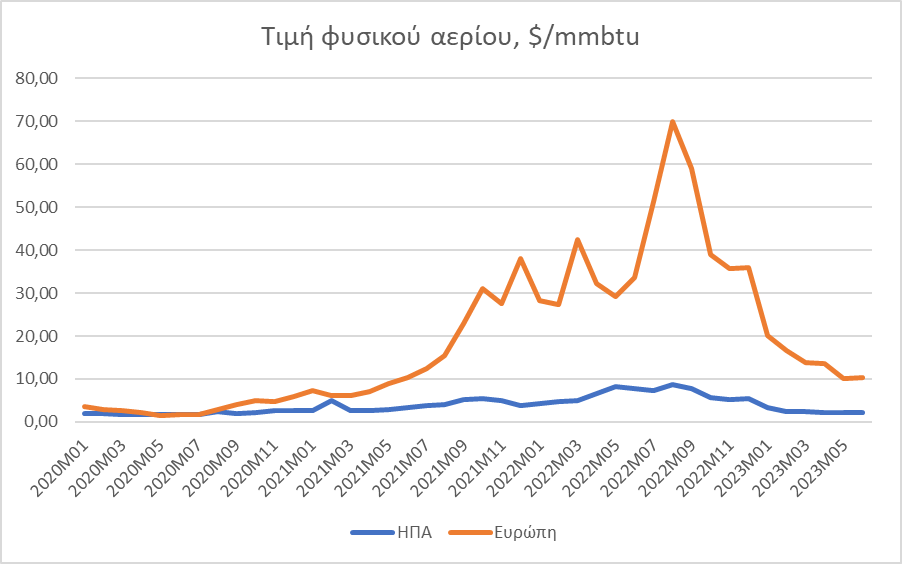 Ωστόσο, η στήριξη στην Ουκρανία στην οποία πλέον πρωταγωνιστούν οι Ευρωπαίοι στοιχίζει, γιατί συνοδεύτηκε από μια θεμελιώδη αλλαγή των όρων του οικονομικού παιχνιδιού στην ιδιωτική οικονομία. Κι ο πρώτος όρος περιλάμβανε την φθηνή ενέργεια από την Ρωσία. Σήμερα παρότι έχει περάσει σχεδόν ενάμισι χρόνος από το ξέσπασμα του πολέμου, κι οι φόβοι για ελλείψεις στην τροφοδοσία φυσικού αερίου ανήκουν στο παρελθόν, γίνεται συνείδηση καθημερινά ότι η νέα κανονικότητα στον ενεργειακό εφοδιασμό της Ευρώπης περιλαμβάνει φυσικό αέριο που στοιχίζει όχι μόνο ακριβότερα από το παρελθόν, αλλά και πέντε φορές ακριβότερα από την τιμή που το πληρώνουν οι αμερικανικές εταιρείες. Η τιμή του φυσικού αερίου ακόμη και την άνοιξη του 2020 ήταν ίδια στις δύο όχθες του Ατλαντικού. Έκτοτε μεσολάβησε η επιτάχυνση της Πράσινης Μετάβασης στην Ευρώπη τον Ιούλιο του 2021 που αύξησε σημαντικά την τιμή του αερίου. Στη συνέχεια, με το ξέσπασμα του πολέμου τον Φεβρουάριο του 2022 τα αλλεπάλληλα κύματα κυρώσεων της ΕΕ στη Ρωσία, με απώτερο στόχο την διακοπή των ροών και την υποκατάστασή τους από αμερικανικό υγροποιημένο φυσικό αέριο (LNG), οδήγησαν την τιμή του φυσικού αερίου στο χρηματιστήριο του Άμστερνταμ να απογειωθεί. Φτάσαμε έτσι τον Ιούνιο του 2023 η τιμή στις ΗΠΑ να είναι 2,18 και στην Ευρώπη 10,35 δολάρια, σχεδόν πέντε φορές ακριβότερη!