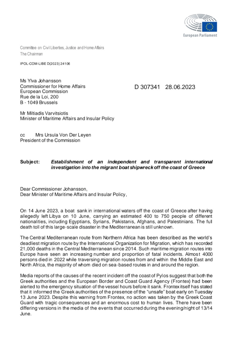 «Δημοσιογραφικές αναφορές για τα αίτια του πρόσφατου περιστατικού στα ανοιχτά της Πύλου δείχνουν ότι τόσο οι ελληνικές αρχές όσο και η Ευρωπαϊκή Υπηρεσία Συνοροφυλακής και Ακτοφυλακής (Frontex) είχαν ειδοποιηθεί για την επείγουσα κατάσταση του σκάφους ώρες πριν βυθιστεί. Η ίδια η Frontex δήλωσε ότι ενημέρωσε τις ελληνικές αρχές για την παρουσία “μη ασφαλούς” βάρκας νωρίς την Τρίτη, 13 Ιουνίου 2023. Παρά την προειδοποίηση αυτή της Frontex, καμία ενέργεια δεν έκανε το Ελληνικό Λιμενικό, με τραγικές συνέπειες και τεράστιο κόστος σε ανθρώπινες ζωές. Υπάρχουν διαφορετικές εκδοχές στα μέσα ενημέρωσης για τα περιστατικά που συνέβησαν το βράδυ της 13/14 Ιουνίου».