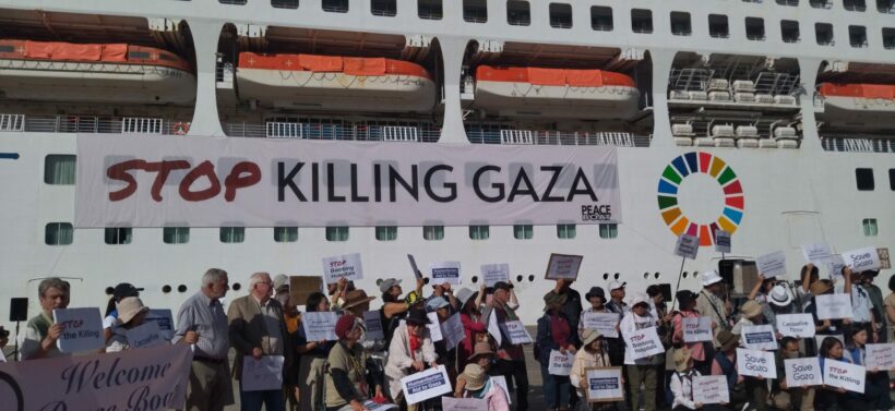 Η σημαντικότερη έγινε στις 10 το πρωί στην προβλήτα μπροστά στο λιμάνι όπου έγινε η ανάρτηση τεράστιου πανό με το σύνθημα Stop Killing Gaza «Σταματήστε να σκοτώνετε τη Γαζα» το οποίο θα εμφανίζεται κατά την παρουσία του Peace Boat και στα λιμάνια, Κωνσταντινούπολης (5 Νοεμβρίου) και Port Said (8-9 Νοεμβρίου). Σε αυτήν παρευρέθηκαν πολλοί γιαπωνέζοι, αρκετά μέλη της Παλαιστινιακής κοινότητας και έλληνες ακτιβιστές που κρατούσαν πινακίδες με μηνύματα όπως «Σώστε τη Γάζα» «Εκεχειρία τώρα» «Τα νοσοκομεία ΔΕΝ είναι στόχοι» «Ανθρωπιστική βοήθεια στη Γαζα» «Σταματήστε να βομβαρδίζετε τα νοσοκομεία», ενώ υπήρχε και μεγάλο πανό της οργάνωσης «Αλληλεγγύη για όλους» που έγραφε «No Justice No Peace, Αλληλεγγύη στην Παλαιστίνη» και ένα του ΠΑΔΟΠ που έγραφε «Καλωσήλθες Πλοίο της Ειρήνης».