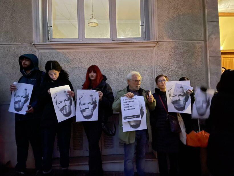 Διαμαρτυρία για την απελευθέρωση του Τζούλιαν Ασάνζ πραγματοποιήθηκε χθες έξω από την Βρετανική Πρεσβεία στην Αθήνα, όπως και σε πολλές άλλες πόλεις σε όλο τον κόσμο.